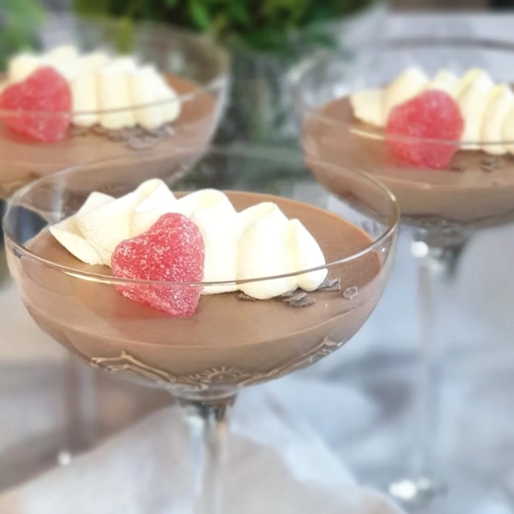 8. Vispa 1 dl grädde och fördela ovanpå moussen och dekorera ev med ett geléhjärta