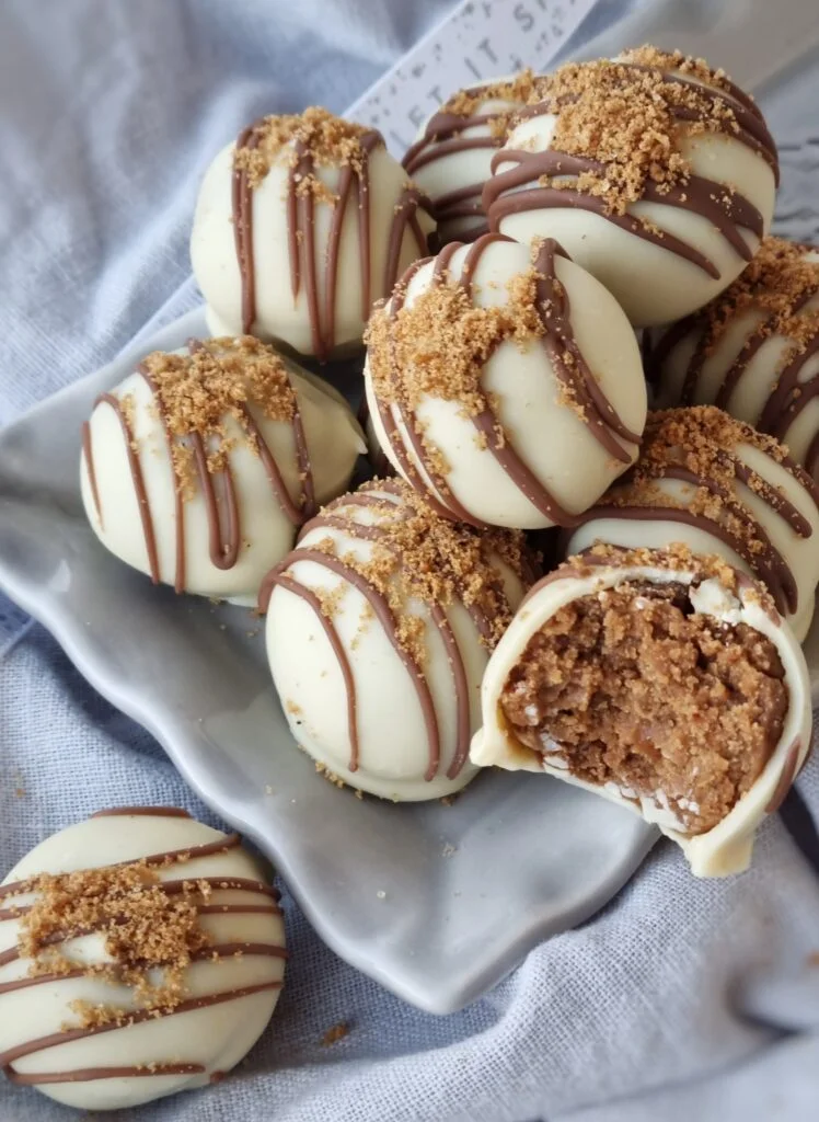 2. Rör ihop de finkrossade pepparkakorna med färskosten och rulla till jämnstora bollar och stick ner en tandpetare i varje. Frys in ca 30 minuter.